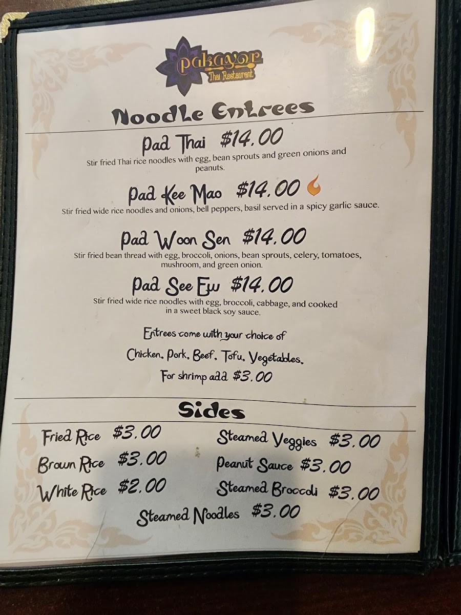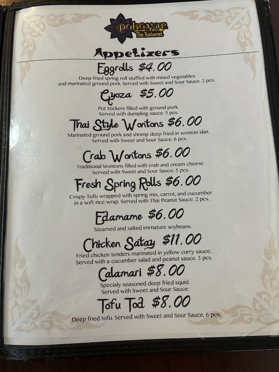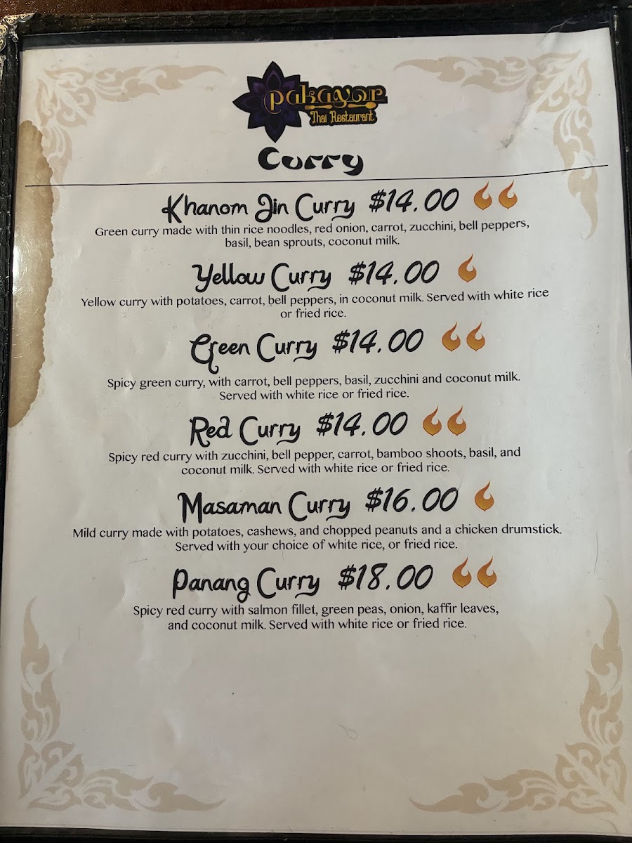 Pakayor Thai restaurant Menu